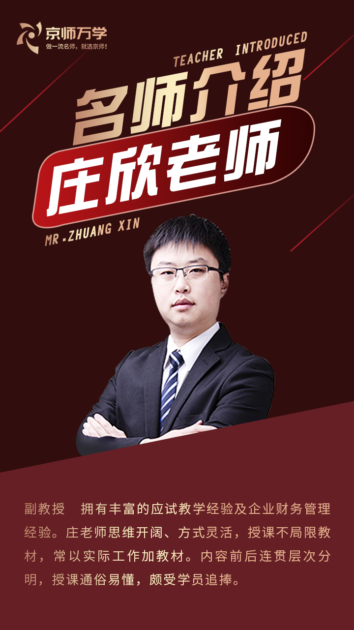 拥有丰富的应试教学经验及企业财务管理经验。庄老师思维开阔、方式灵活,授课不局限教材,常以实际工作加教材。内容前后连贯层次分明,授课通俗易懂,颇受学员追捧。